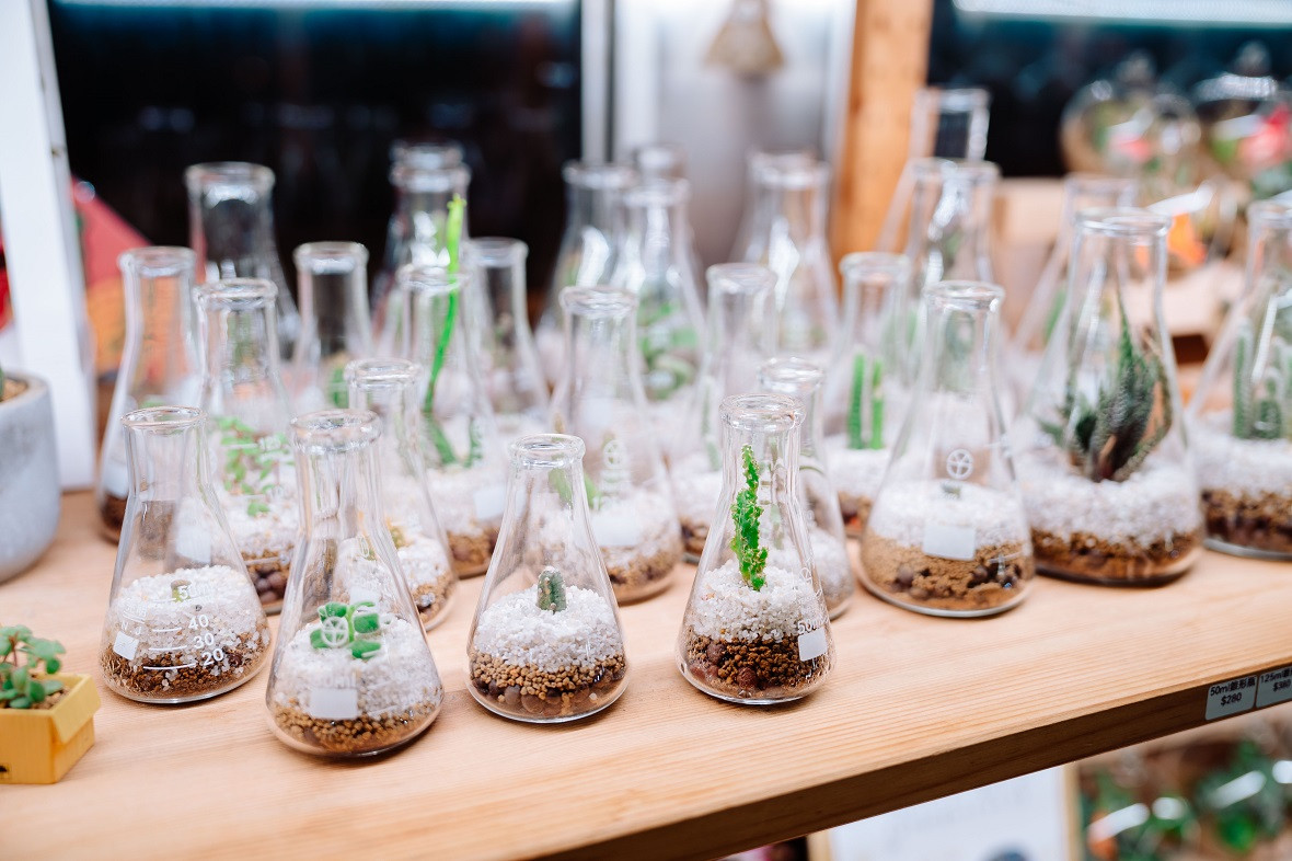 這裡除了人氣商品「燒杯植栽」、「扭蛋植栽」之外