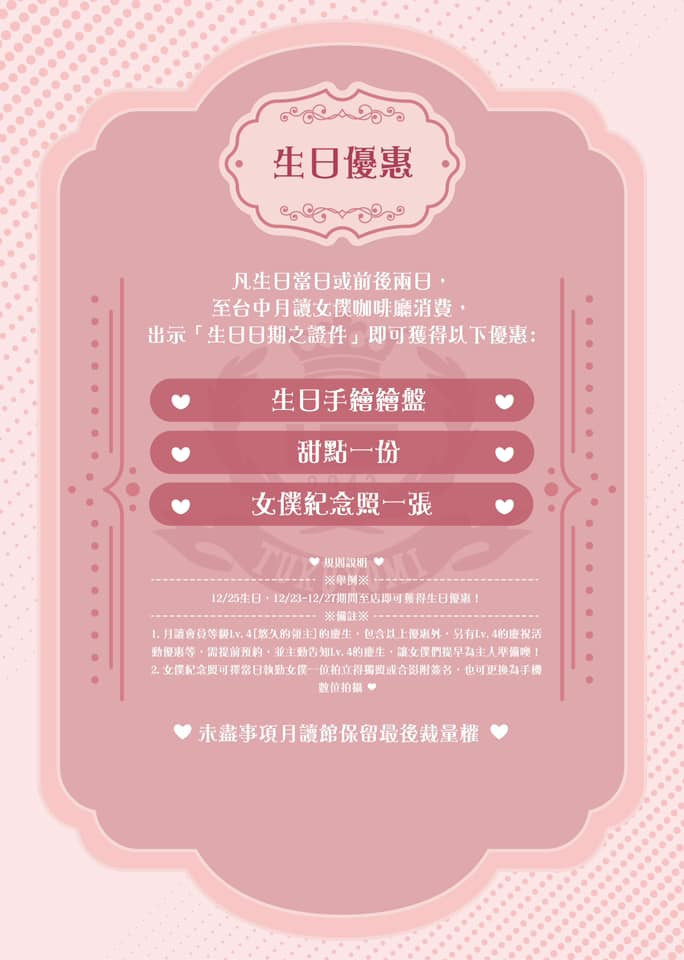凡生日當日或前後2日,至台中月讀女僕咖啡廳消費